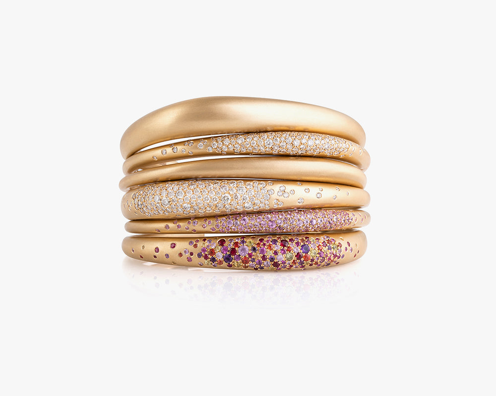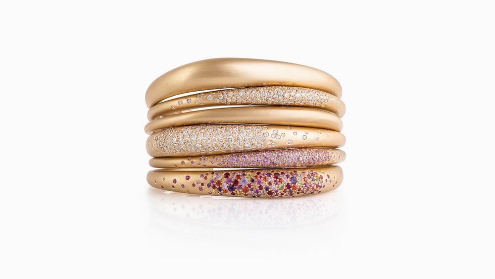 Nada uses rough, hand brushed 18K gold, sometimes pure and sometimes set with signature scattered gems. keeping true to her unique code. Special pieces are exquisitely contrasted with bright loud enamel that decorates purposefully imperfect or incomplete patterns. Each jewel is meticulously finished exhibiting impeccable artistry and craftsmanship.